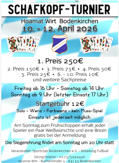 Weitere schöne Sachpreise und Gutscheine zur freien Auswahl. Sollten die 30 Tische im Gerätehaus nicht ausreichen, steht vor der Fahrzeughalle ein beheiztes Zelt zur Verfügung. 01717594023 Ludwig Zielbauer kurzes Blatt, mit Solo und Wenz Plus Punkte